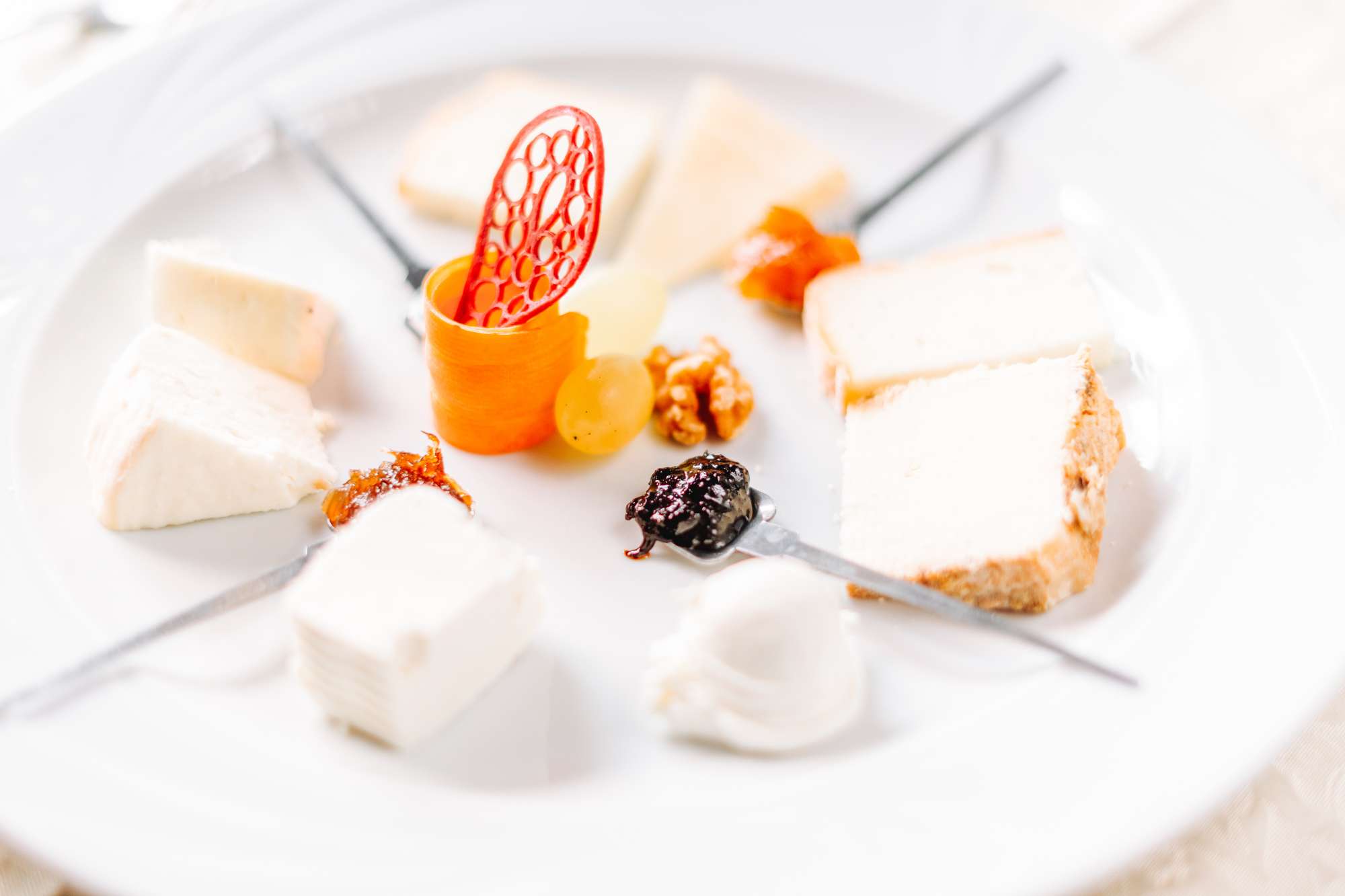 L’esperienza gastronomica si apre con un antipasto di benvenuto a base di yogurt aromatizzato e burro salato. Segue una selezione di otto formaggi — quattro freschi e quattro stagionati, accompagnati da pane croccante, crostini, marmellate artigianali e miele.
